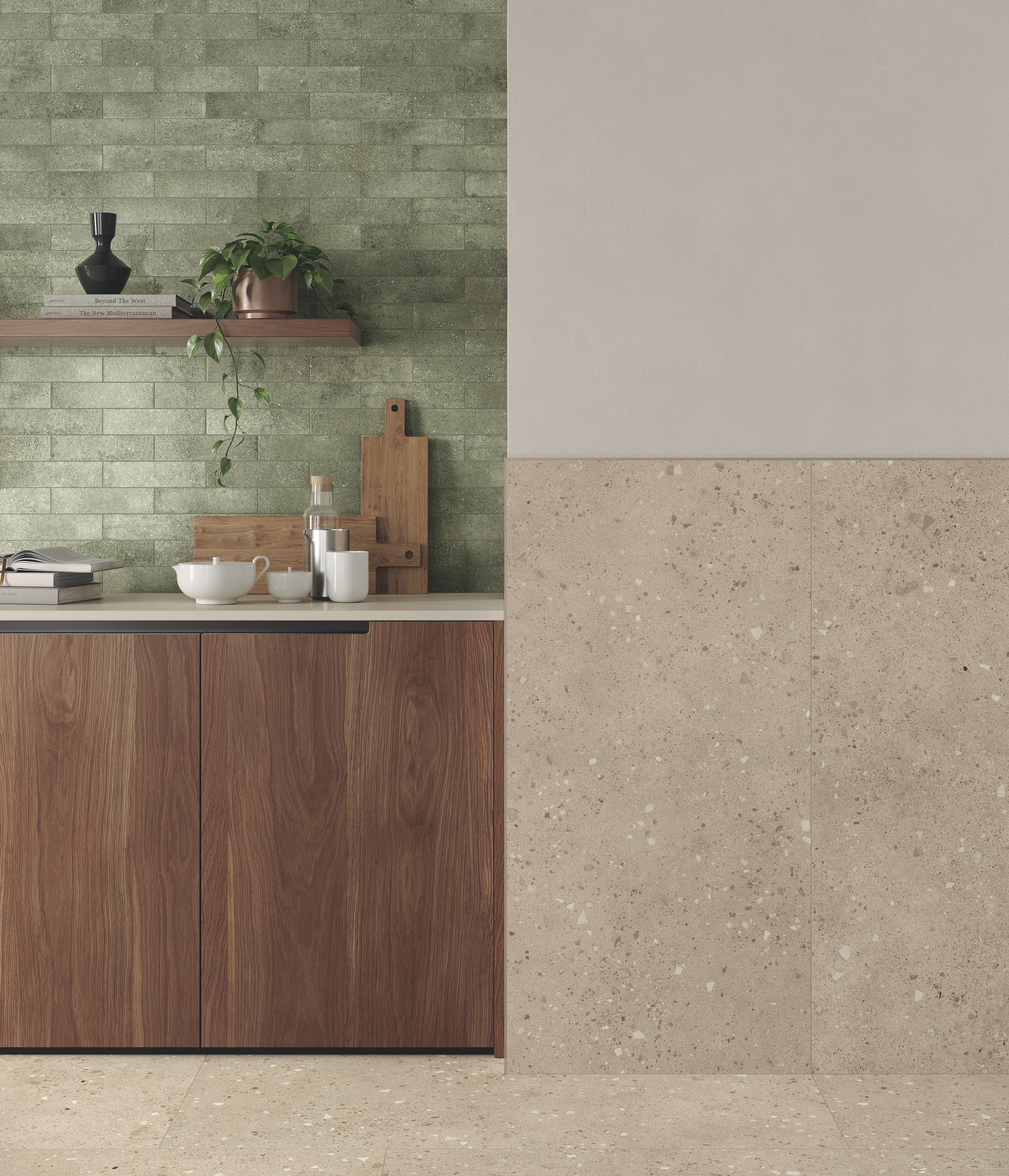 Imagine a space that blends contemporary trends with the elegance of natural textures. Grain features a concrete-inspired agglomerate effect, with micro and macro granules that create a richly nuanced texture. The warm, Mediterranean palette—with tones ranging from ivory to sand, and accents like Ash and Earth—transforms any space into a refined setting. The collection is enhanced by 40x80 wall tiles in Moss and Forest green, perfect for commercial and residential spaces. The glossy, textured Brick 7.5x30 tile completes the collection with a distinctive, modern touch. Grain is the ideal choice for those seeking elegance and versatility.