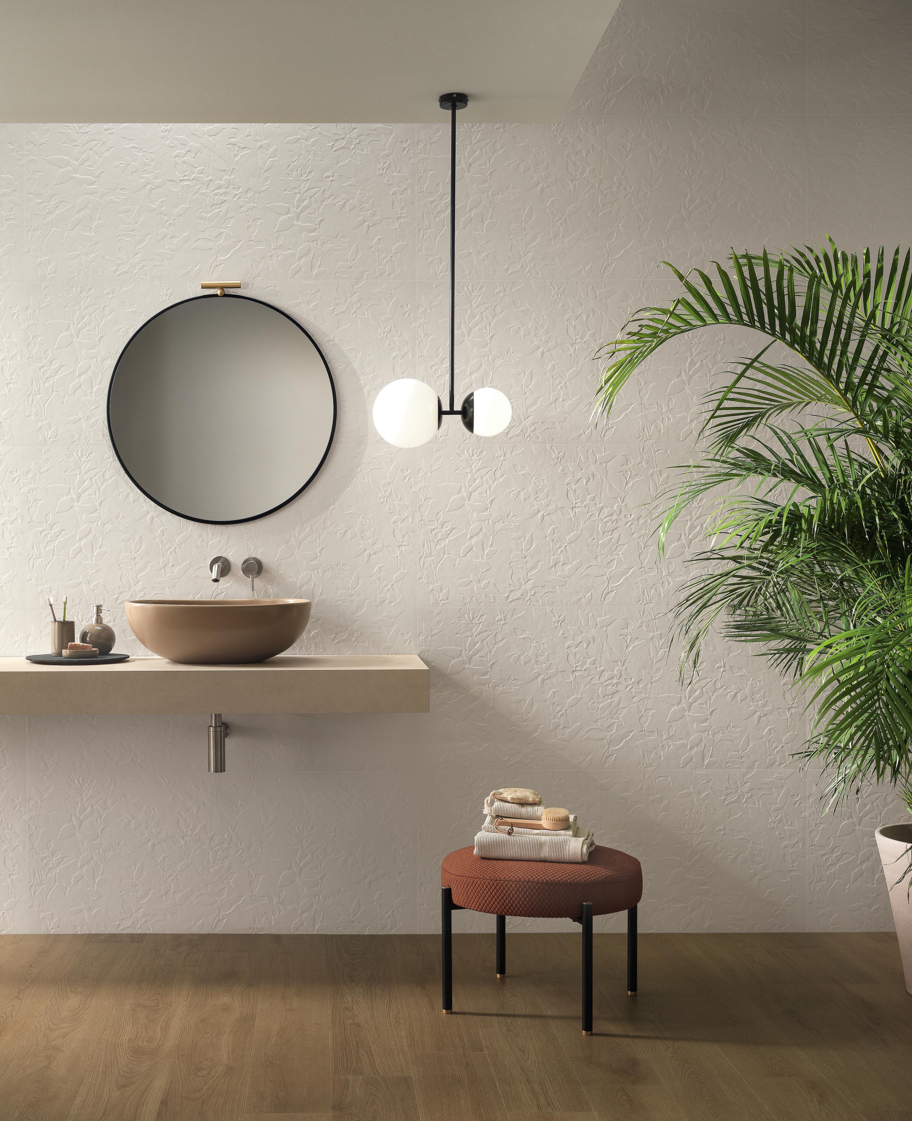3D Jasmine se caracteriza por un patrón botánico de hojas de jazmín inspirado en las superficies de yeso grabadas a mano. Gracias a su impermeabilidad, los azulejos de baño tridimensionales también pueden aplicarse en sitios donde hay agua y humedad.