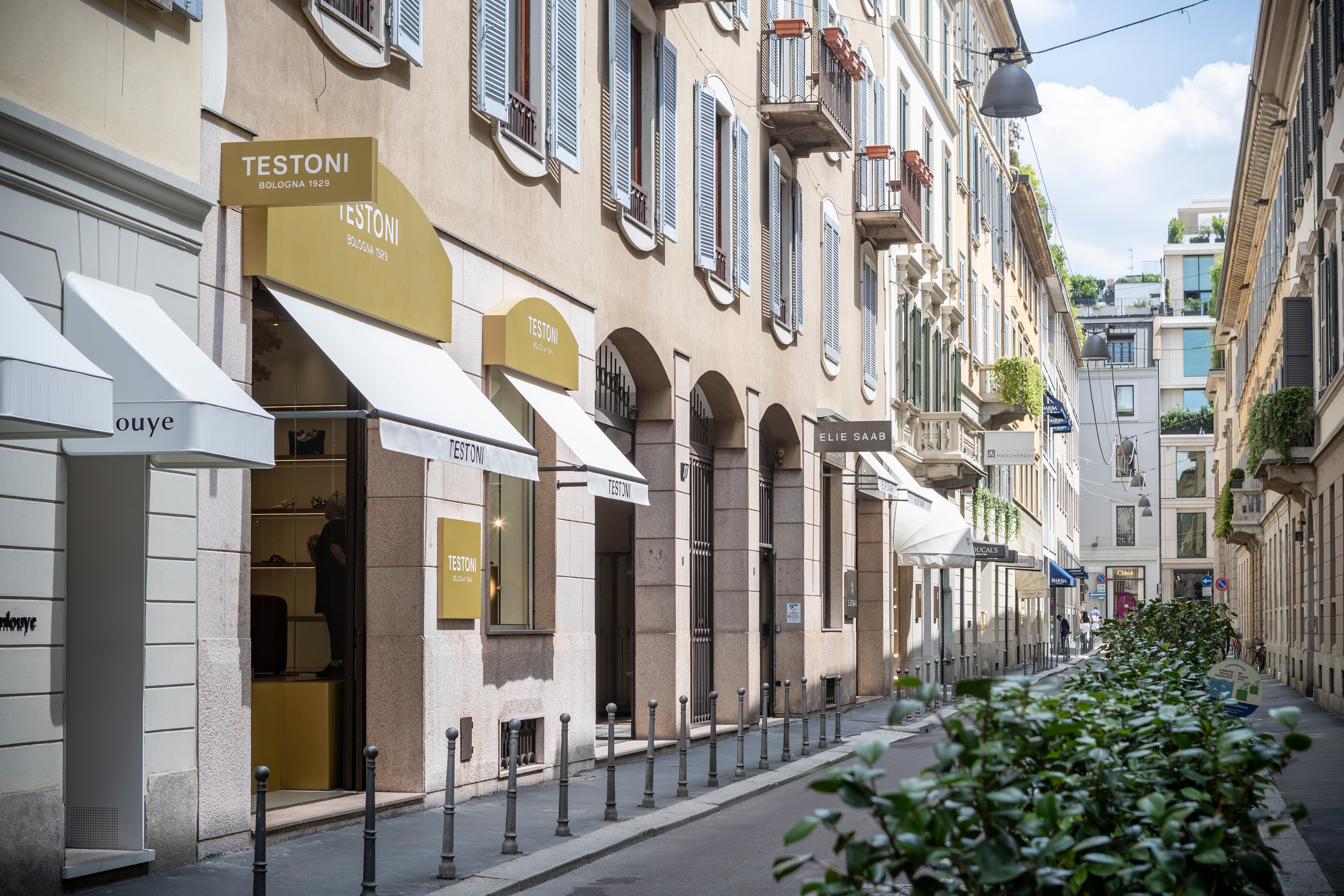 Testoni ha elegido la Via del Gesù de Milán, entre Via Montenapoleone y Via della Spiga, en el corazón del cuadrilátero de la moda, para mostrar la elegancia y la extrema belleza de sus zapatos artesanales, celebrados en todo el mundo desde 1929.